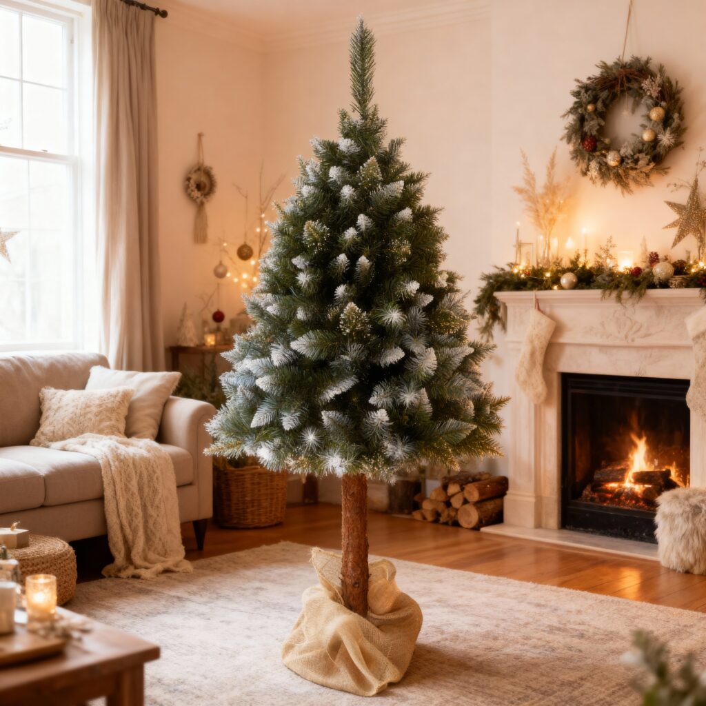 Ta choinka  wygląda jak prawdziwa, gęsta sosna – zielone igły, subtelne ośnieżenie i naturalny drewniany pień tworzą efekt drzewka prosto z lasu. Wystarczy, że ustawisz ją w salonie, a przestrzeń od razu nabiera świątecznego klimatu, który widać na pierwszy rzut oka – idealna sceneria do światełek, prezentów i wspólnych zdjęć.